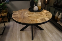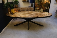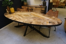 Ovale industriële salontafel met tafelblad van ingelegde mangohout stroken gecombineerd met metalen onderstel.